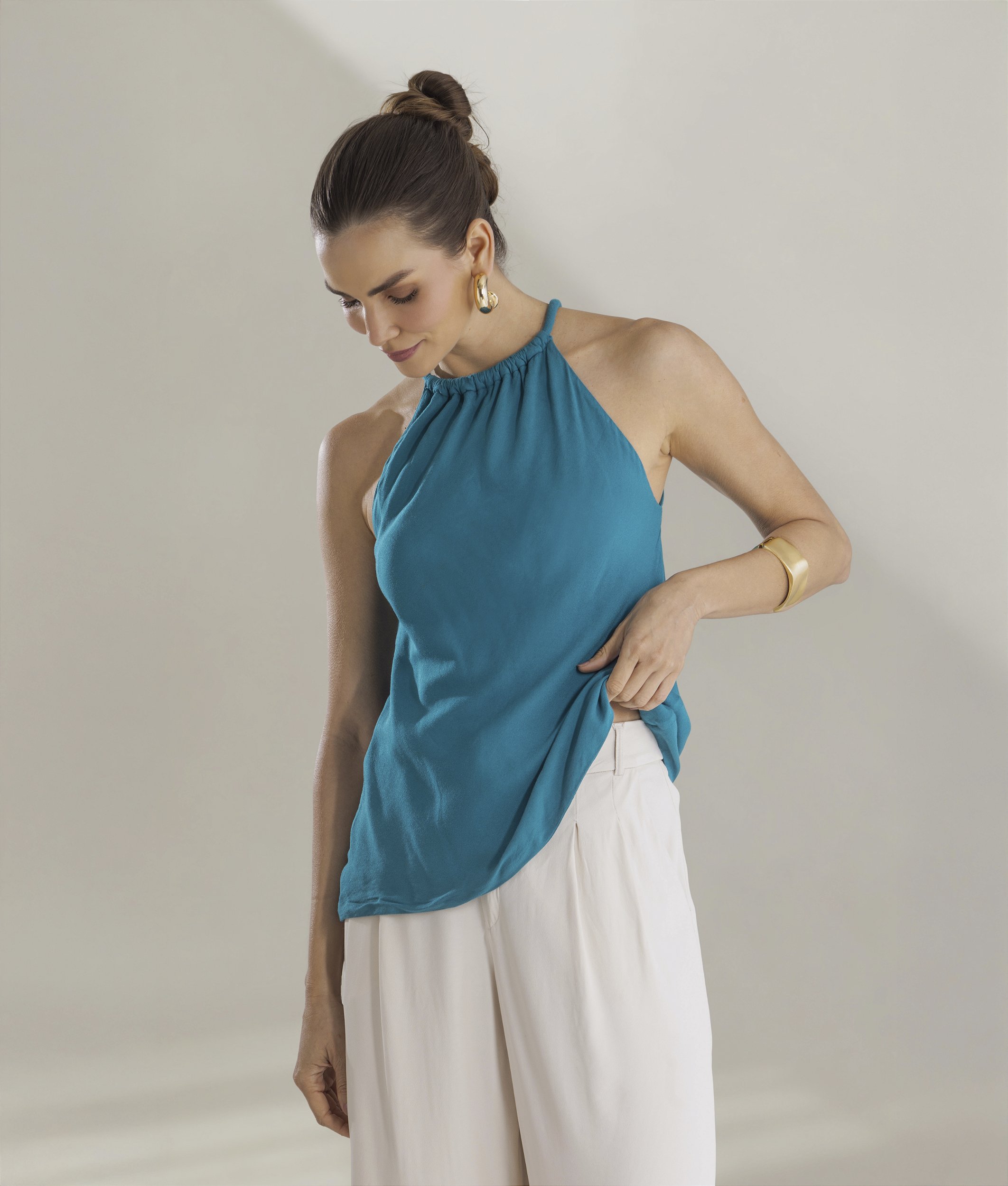 A Regata Cavada é um modelo elegante e atemporal. Feita em tecido 100% viscose, tem caimento fluido e leve. Possui decote redondo, cavas levemente acentuadas e franzido no decote frente e costas. Além disso, é forrada na frente, tem comprimento médio e fechamento nas costas com botão.