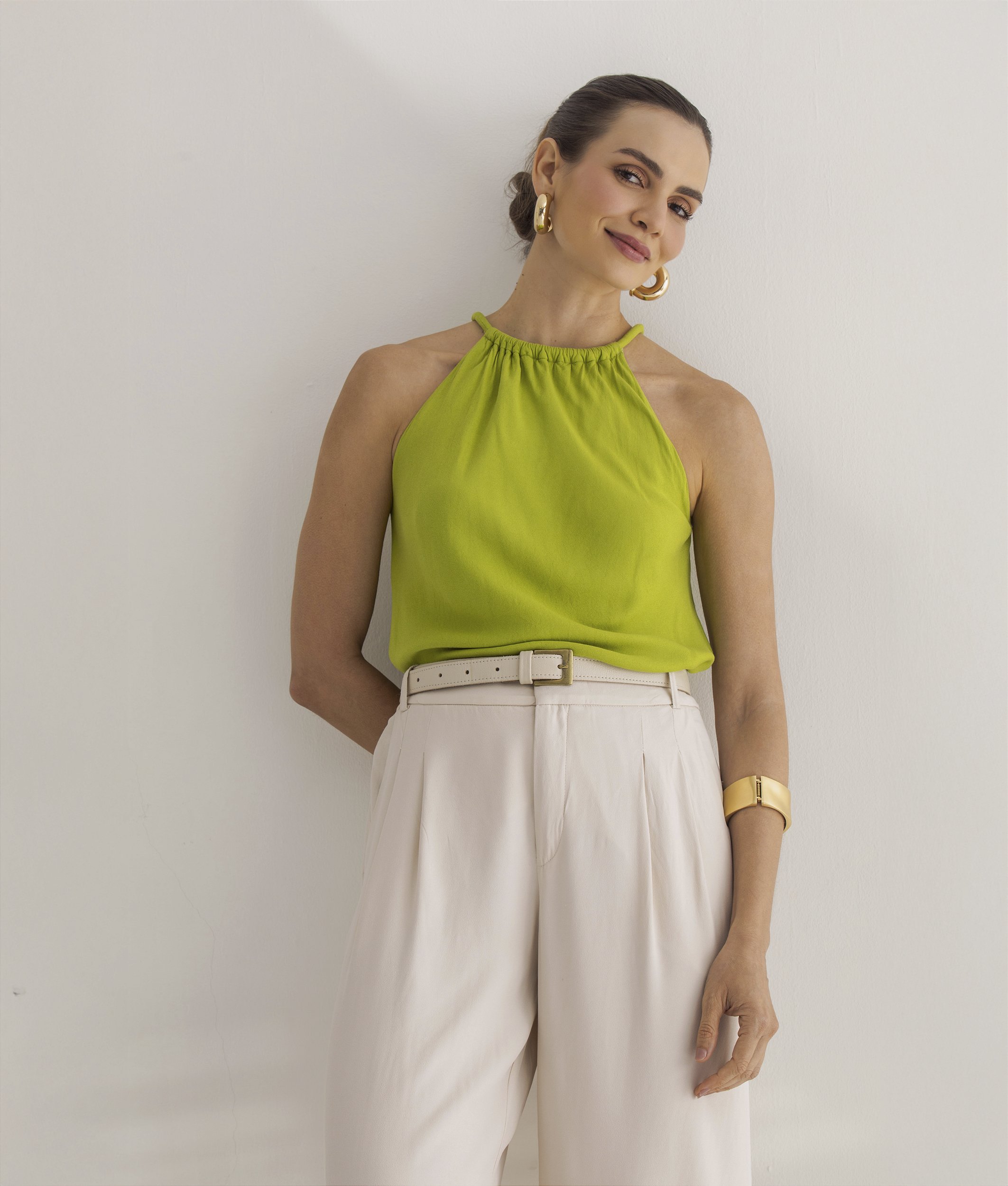 A Regata Cavada é um modelo elegante e atemporal. Feita em tecido 100% viscose, tem caimento fluido e leve. Possui decote redondo, cavas levemente acentuadas e franzido no decote frente e costas. Além disso, é forrada na frente, tem comprimento médio e fechamento nas costas com botão.